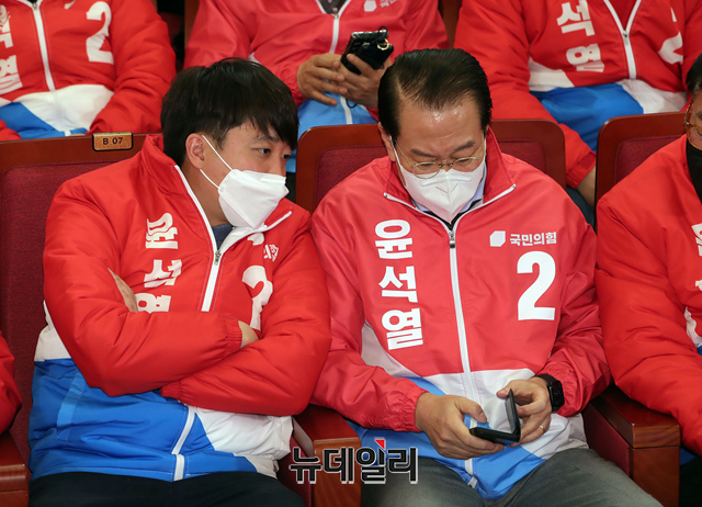 이준석 국민의힘 당대표와 권영세 총괄선대본부장, 김기현 원내대표이 9일 오후 국회 도서관에 차려진 '국민의힘 제 20대 대통령선거 개표상황실'에서 대화를 나누고 있다.