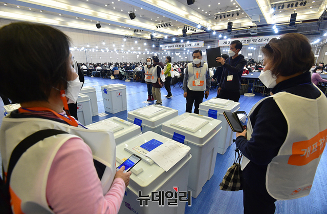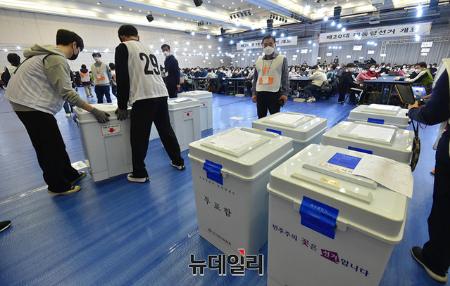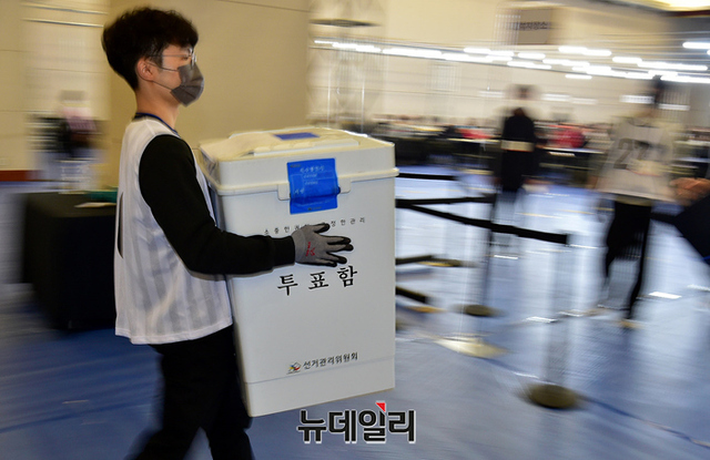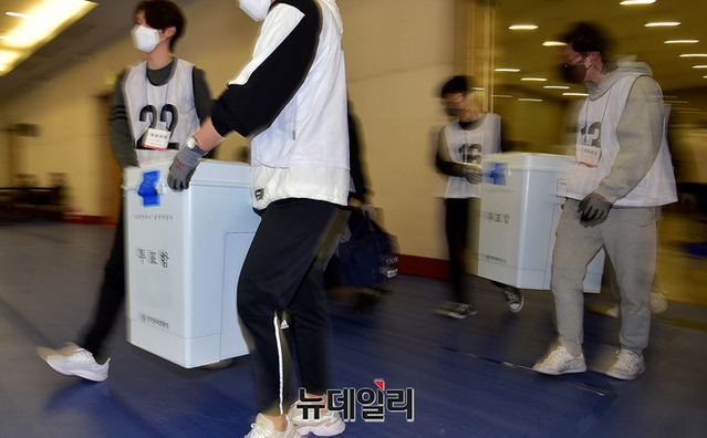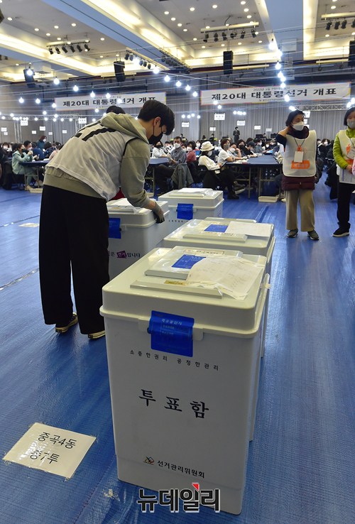 제20대 대통령선거 투표함이 9일 오후 서울 광진구 세종대학교에 마련된 개표소로 하나씩 들어오고 있다.
