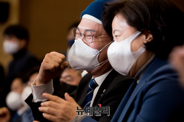 이낙연 더불어민주당 총괄선대위원장과 송영길 대표, 윤호중 원내대표, 추미애 명예선대위원장 등 당 지도부가 9일 오후 국회 의원회관 개표 상황실에서 방송 3사 출구조사 결과를 지켜보며 환호하고 있다.