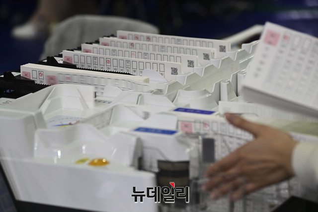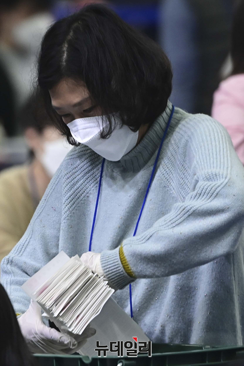 투표를 마친 9일 오후 서울 영등포구 다목적 배드민턴체육관에 마련된 개표소에서 개표원들이 투표함을 개함하기 위해 옮기고 있다.
