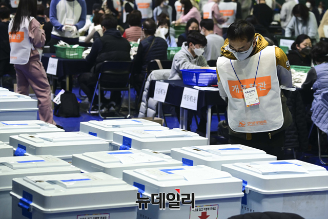 투표를 마친 9일 오후 서울 영등포구 다목적 배드민턴체육관에 마련된 개표소에서 선거관리위원회 관계자들이 투표함에 부착된 특수 봉인지를 살펴보고 있다.