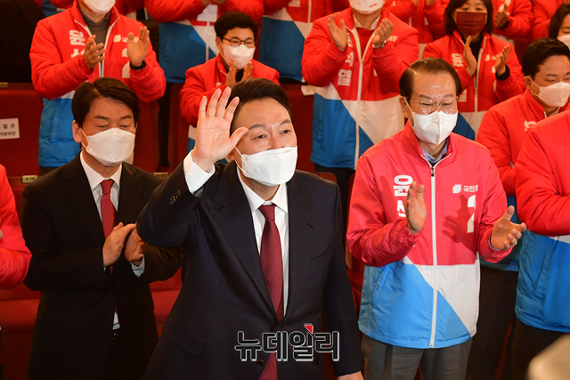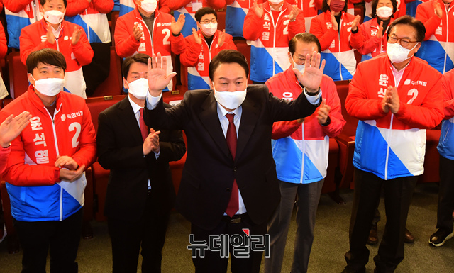 윤석열 대통령 당선인이 10일 오전 국회 도서관에 마련된 '국민의힘 제 20대 대통령선거 개표상황실'을 찾아 손들어 인사하고 있다.