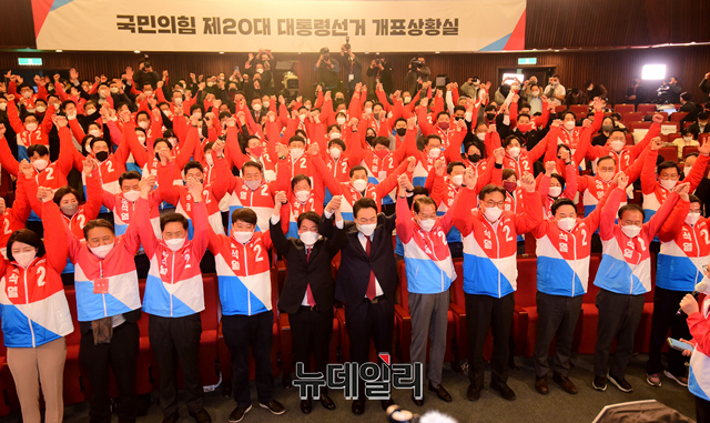 윤석열 대통령 당선인과 당 지도부가 10일 오전 국회 도서관에 마련된 '국민의힘 제 20대 대통령선거 개표상황실'에서 만세삼창을 하고 있다.