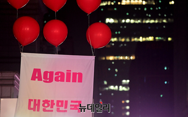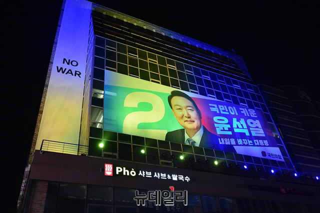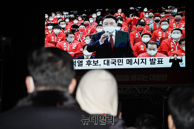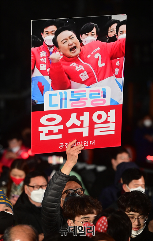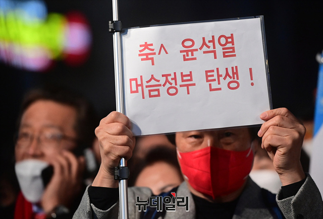 윤석열 국민의힘 대선후보 지지자들이 10일 새벽 서울 여의도 국민의힘 당사 앞에 마련된 특설무대에서 윤 후보의 당선이 확실시 되자 환호하고 있다.
