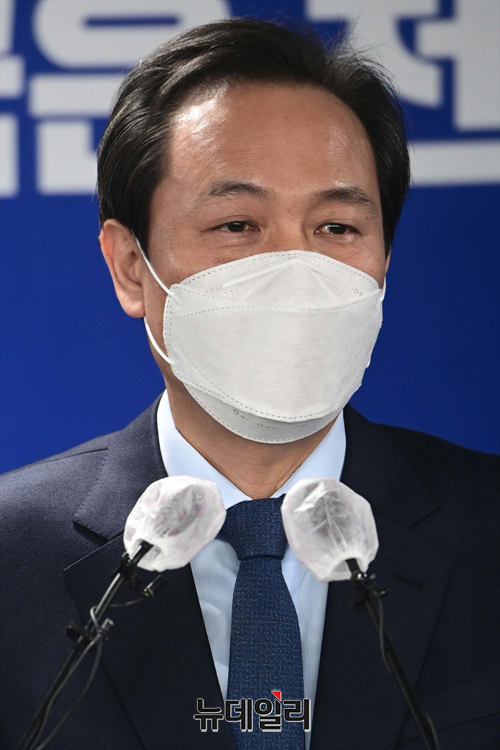 우상호 더불어민주당 총괄선대본부장이 10일 오후 서울 여의도 더불어민주당사에서 열린 선대위 해단식에서 눈시울을 붉히고 있다.