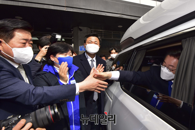 [포토] 이재명, 민주당 해단식 마치고 지지자와 인사