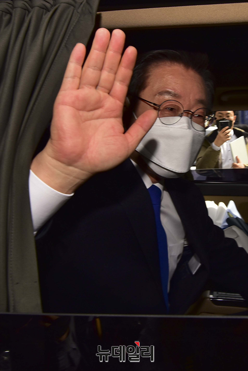 이재명 더불어민주당 대선후보가 10일 오후 서울 여의도 더불어민주당사에서 열린 선대위 해단식을 마치고 차량에서 지지자들과 인사를 하고 있다.