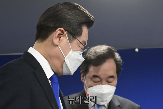 이재명 더불어민주당 대선후보와 이낙연 총괄선대위원장이 10일 오후 서울 여의도 더불어민주당사에서 열린 선대위 해단식에서 인사를 나누고 있다.