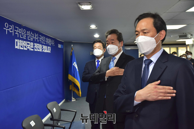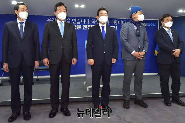 우상호 총괄선대본부장, 이낙연 총괄선대위원장, 이재명 대선후보, 송영길 대표, 윤호중 원내대표(왼쪽부터)가 10일 오후 서울 여의도 더불어민주당사에서 열린 선대위 해단식에서 기념촬영을 마치고 허리를 굽혀 인사를 하고 있다.
