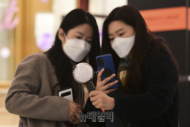 방탄소년단(BTS)의 팬이 11일 오전 서울 송파구 롯데백화점 잠실점에 마련된 익스프레스 공식 상품 판매 스토어에서 기념촬영을 하고 있다.