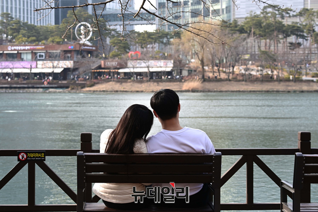 최고기온이 영상 22도까지 오르고 완연한 봄 날씨를 보이고 있는 11일 오후 서울 송파구 석촌호를 찾은 시민들이 가벼운 옷차림으로 산책을 하고 있다.