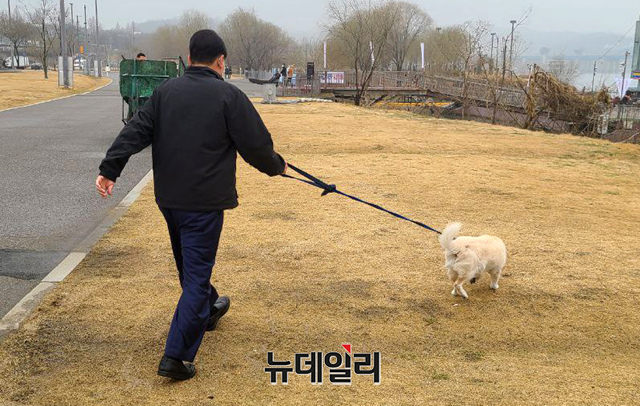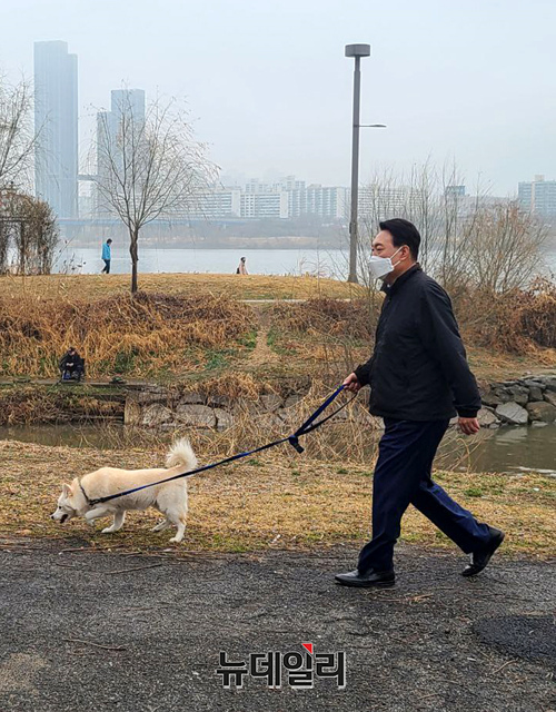 [포토] 반려견과 한강공원 산책하는 윤석열 대통령 당선인