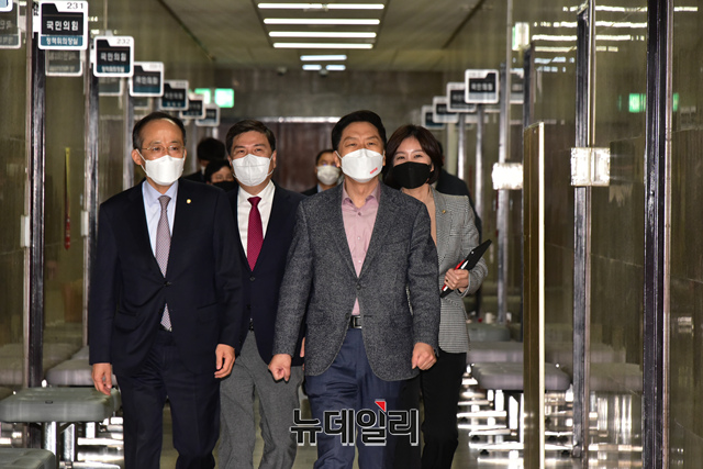 김기현 국민의힘 원내대표와 지도부가 14일 오전 국회에서 열린 최고위원회의에 참석하기 위해 입장하고 있다. (사진=공동취재단)