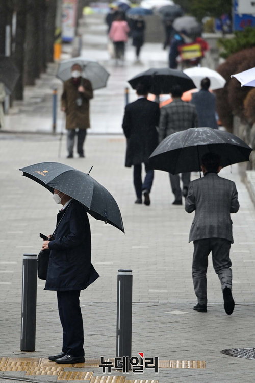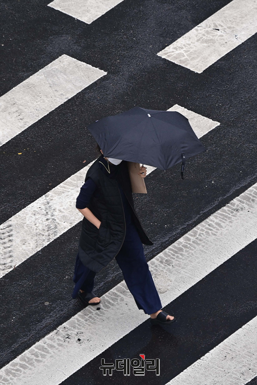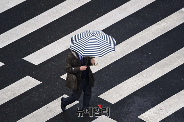 전국 대부분 지역에 비가 내린 14일 오후 서울 서초구 중앙지방법원 인근에서 시민들이 우산을 쓰고 횡단보도를 건너고 있다.