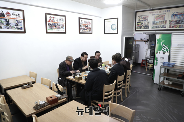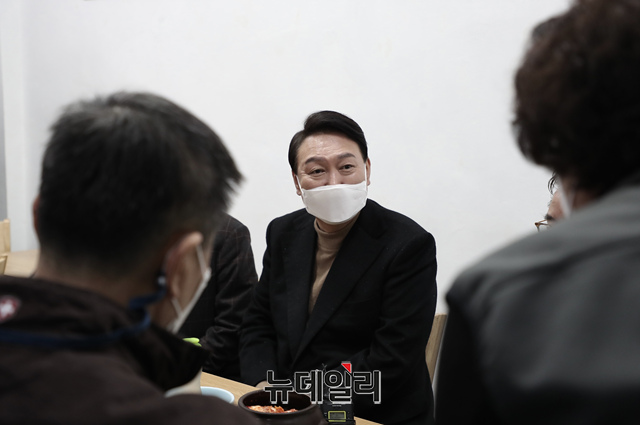 윤석열 대통령 당선인이 14일 오전 서울 남대문 시장을 찾아 상인회 회장단과 간담회를 마친 뒤 식당에서 식사를 하고 있다. (사진=윤석열 캠프)