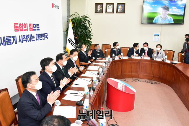 이준석 국민의힘 대표가 15일 오전 국회에서 열린 시도당위원장 회의에 화상으로 참석해 발언하고 있다. (사진=공동취재단)