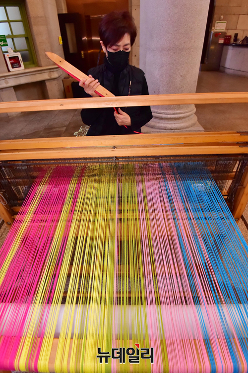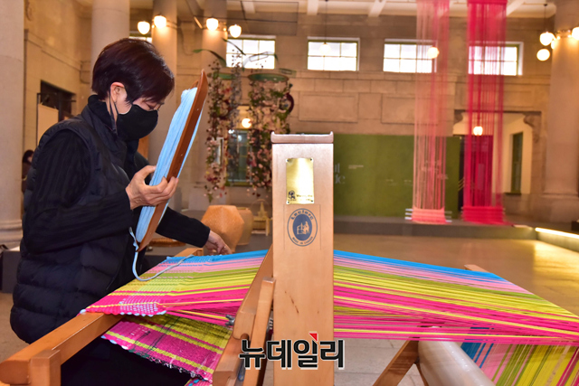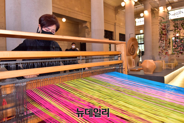 [포토] 공예전시 '사물을 대하는 태도' 위빙 시연하는 한선주 작가