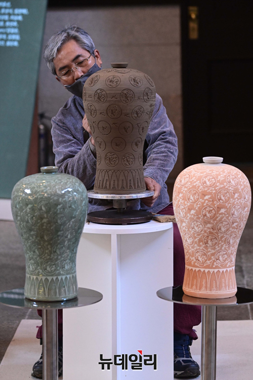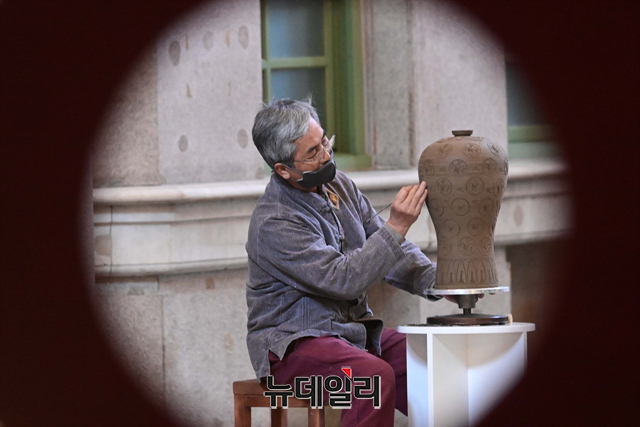 이은규 작가가 15일 오후 서울 중구 문화역서울284에서 열린 '사물을 대하는 태도(ALL About Attitude)' 기획전시에서 청자 상감을 시연하고 있다.
