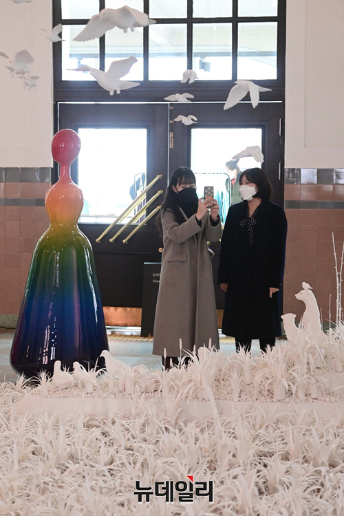 '사물을 대하는 태도(ALL About Attitude)' 기획전 일반 공개를 앞둔 15일 오후 서울 중구 문화역서울284에서 관계자들이 전시를 관람하고 있다.