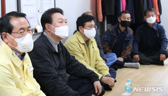 윤석열 대통령 당선인이 15일 오후 경북 울진군 북면 부구3리마을회관을 찾아 산불피해 이재민들과 간담회 마치고 인사를 하고 있다. (사진=국회사진기자단)