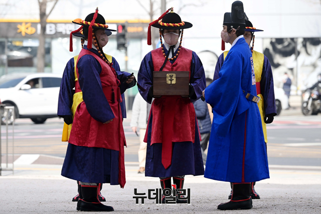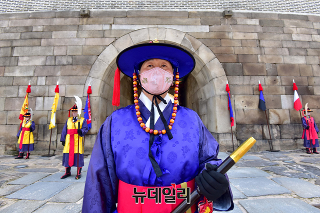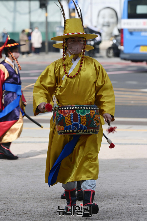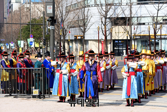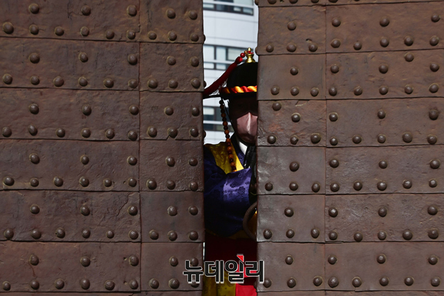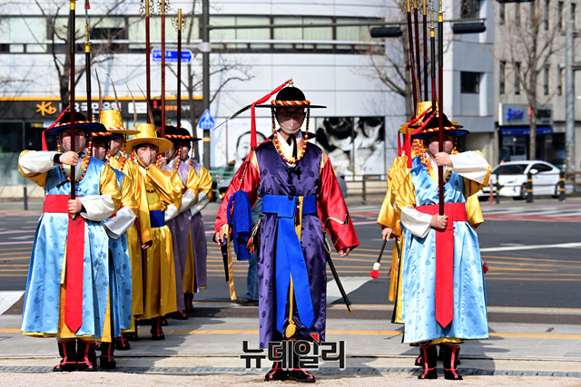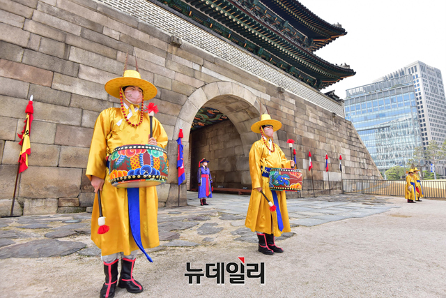 숭례문 파수의식 재현행사가 15일 오후 서울 중구 숭례문에서 진행되고 있다.'숭례문 파수의식 재현행사'는 △도성문을 여닫는 개폐의식 △성을 지키는 수위의식 △성을 순찰하는 순라의식 △수문군 교대의식 등으로 도성 전체를 수비하는 군례의식이다.서울시는 "민족의 무형유산을 활용하기 위해 조선시대 문화의 중흥기였던 영·정조 시대의 무관 장비를 복원 제작을 했다"며 "도성문 파수의식 중 파수군이 도성문과 도성 주변을 지키는 '수위'과․'순라'의식을 재현한 행사를 숭례문에서 2005년부터 진행해왔다"고 말했다.월요일을 제외하고 매일 오전 10시에 도성문을 열고, 오후 3시 30분에 문을 닫는 의식을 재현한다. 야간 파수의식은 8월에 진행 할 예정이다.