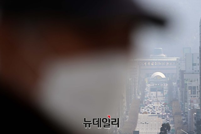 서울·경기·인천·충북 지역의 초미세먼지 농도가 '나쁨' 단계를 보인 16일 오후 서울 서초구 인근에서 마스크를 착용한 시민이 예술의전당을 바라보고 있다.