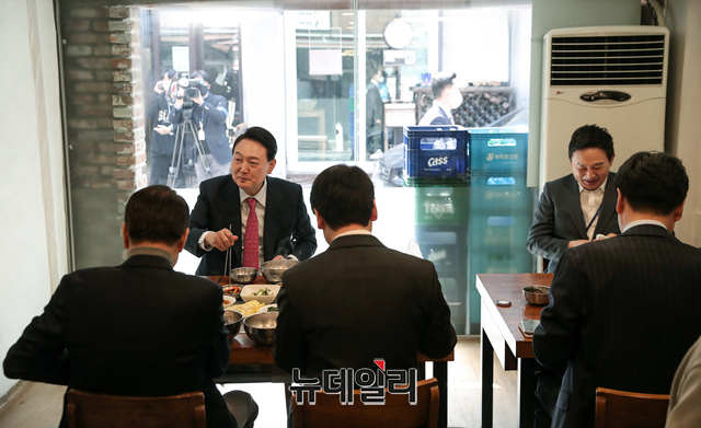 윤석열 대통령 당선인이 16일 서울 종로구 통의동 집무실 인근 식당에서 인수위 지도부와 함께 점심식사로 김치찌개를 먹고 있다. (사진=국민의힘)