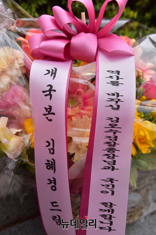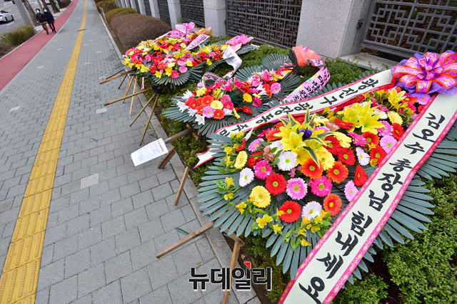 국민의힘 일부 의원들로부터 거취 표명을 요구받은 김 총장이 임기를 끝까지 마치겠다는 취지의 입장을 내놓으며 사퇴 요구를 거부하자 친 민주당 성향 시민들이 응원 화환을 보내고 있다.