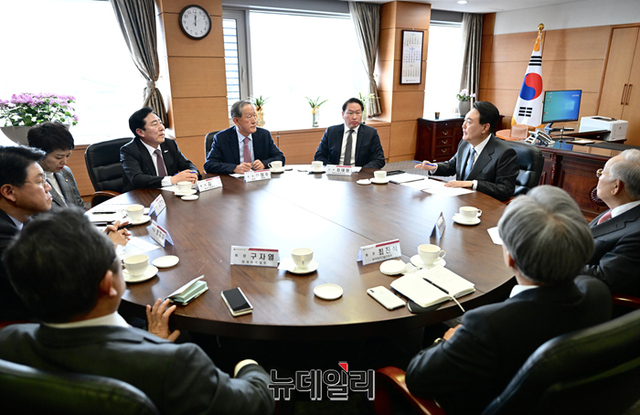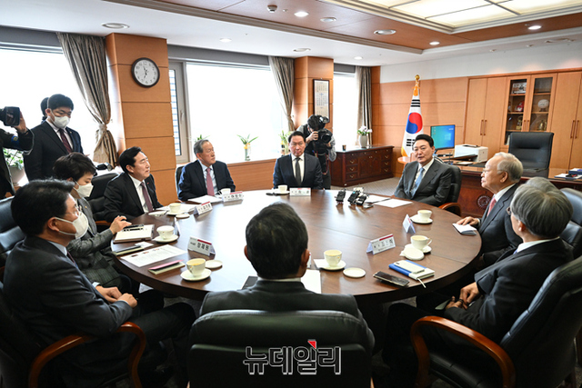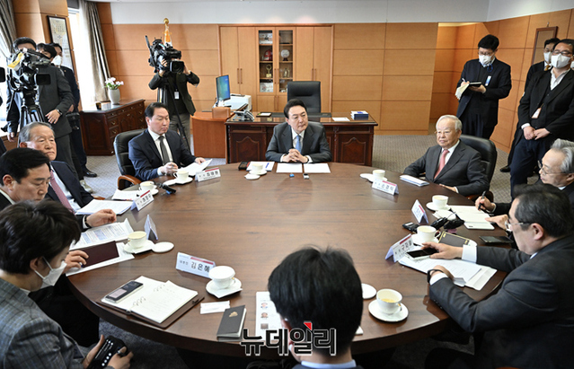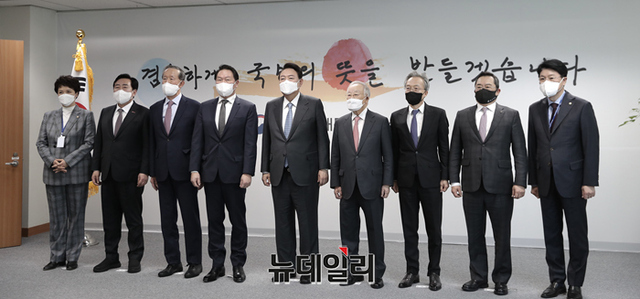 윤석열 대통령 당선인이 21일 오전 서울 종로구 대통령인수위원회 사무실에서 경제6단체장과 현안 논의에 앞서 기념촬영을 하고 있다.이날 회동에는 전국경제인연합회, 대한상공회의소, 한국무역협회, 중소기업중앙회, 한국경영자총협회, 한국중견기업연합회 단체장이 참석했다.왼쪽부터 김은혜 대변인, 김기문 중기중앙회장, 허창수 전경련 회장, 최태원 대한상의 회장, 윤 당선인, 손경식 경총 회장, 최진식 중경련 회장, 구자열 무협 회장, 장제원 비서실장. (사진=국민의힘)