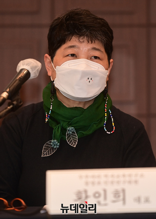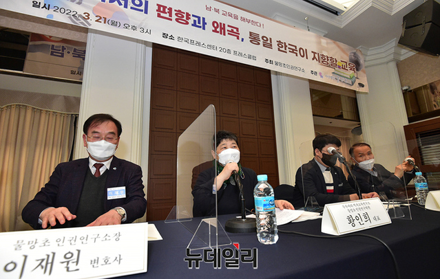 황인희 물망초 연구위원이 21일 오후 서울 중구 한국프레스센터에서 열린 물망초 인권세미나에서 '남한교과서에 파고든 좌편향 실상'을 주제로 발표하고 있다.
