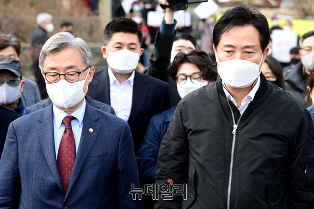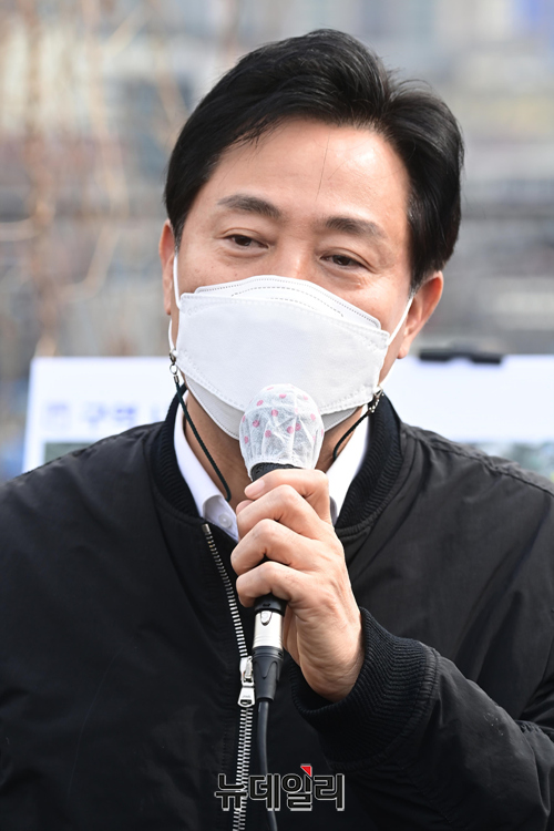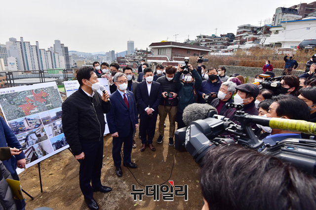 오세훈 서울시장과 최재형 국민의힘 의원이 21일 오후 서울 종로구 '창신동 민간재개발 후보지' 일대를 찾아 추진 상황을 점검하고 있다.
