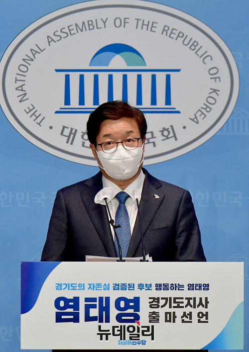 염태영 전 수원시장이 21일 오후 국회 소통관에서 기자회견을 갖고 6.1지방선거 경기도지사 출마를 선언하고 있다.