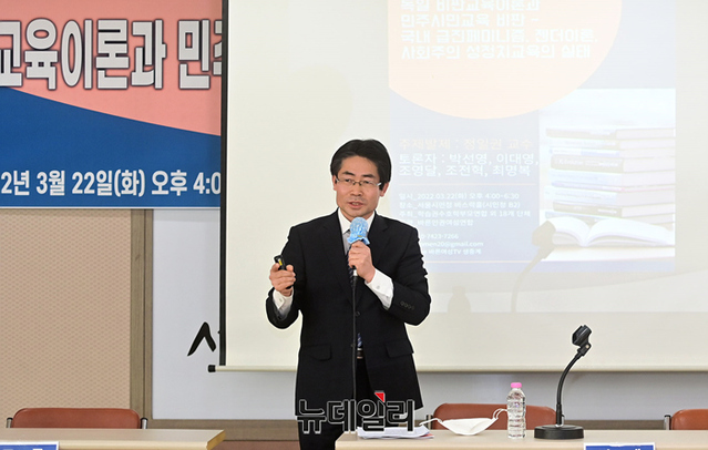 정일권 전 숭실대 초빙교수가 22일 오후 서울 종로구 한국교육문화원에서 바른인권여성연합의 주관으로 열린 '서울시교육감 예비후보에게 듣는다' 공개토론회에서 '독일 비판교육이론과 민주시민교육 비판'을 주제로 발제하고 있다.