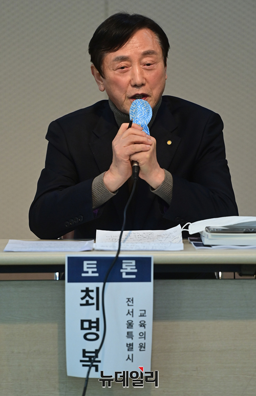 최명복 서울시교육감 예비후보가 22일 오후 서울 종로구 한국교육문화원에서 바른인권여성연합의 주관으로 열린 '서울시교육감 예비후보에게 듣는다' 공개토론회에서 발언하고 있다.