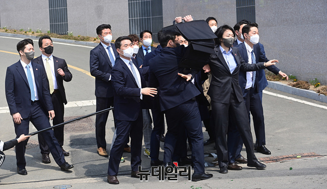박근혜 전 대통령이 24일 오후 대구 달성군 유가읍에 마련된 사저에 입주하기 전 대국민 메시지를 발표하고 있다. 발표 도중 군중속 한 괴한이 소주병을 던져 경호원이 박 전 대통령을 보호하고 있다.