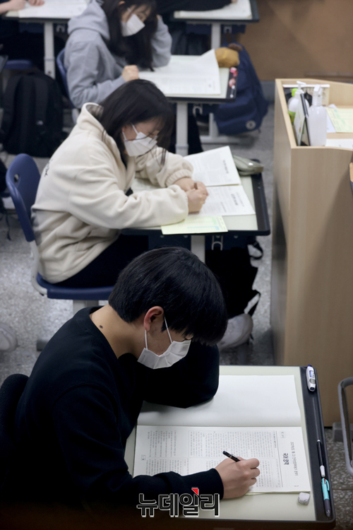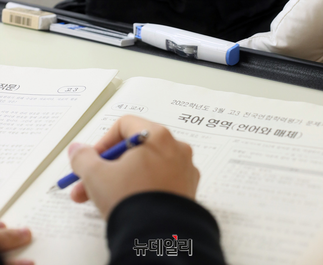 2022학년도 3월 전국연합학력평가가 전국 고등학교 1~3학년 학생 95만 명을 대상으로 시행된 24일 오전 서울 송파구 잠신고등학교 3학년 학생들이 시험지를 살펴보고 있다.