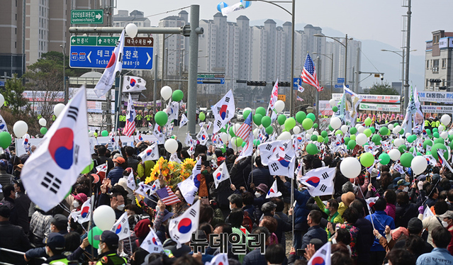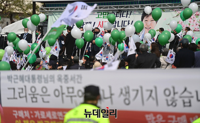 조원진 우리공화당 대표와 지도부가 24일 오후 대구 달성군 유가읍에 마련된 박근혜 전 대통령의 사저 앞에서 환영행사를 열고 있다. 지지자들은 녹색과 흰색 풍선을 들고 박 전 대통령의 사저 입주를 환영했다.박 전 대통령은 이날 오전 8시 32분께 삼성서울병원에서 퇴원하며 "(건강이) 많이 회복됐다"며 "국민 여러분께 5년 만에 인사를 드리게 됐다" 짧은 인사말을 했다.이후 국립서울현충원 박정희·육영수 묘역을 찾아 참배했다. (대구=정상윤 기자)