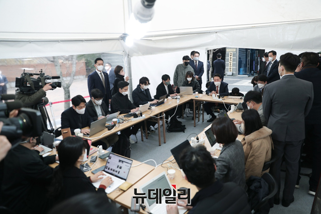 윤석열 대통령 당선인이 24일 오전 서울 종로구 인수위원회에 마련된 프레스 다방에서 취재진들과 만나 대화를 나누고 있다. (사진=인수위)