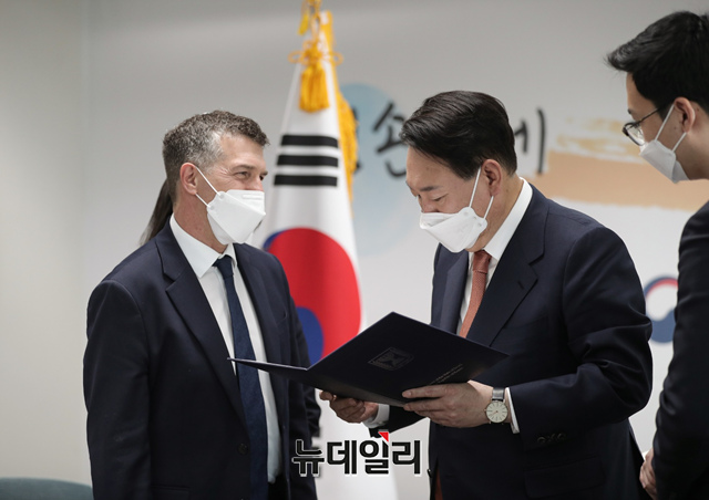 윤석열 대통령 당선인이 24일 오후 서울 종로구 통의동 당선인 집무실에서 아키바 토르 주한 이스라엘 대사를 접견하고 있다. 이날 아키바 토르 주한 이스라엘 대사는 나프탈리 베네트 이스라엘 총리의 축하 서신을 전달했다.