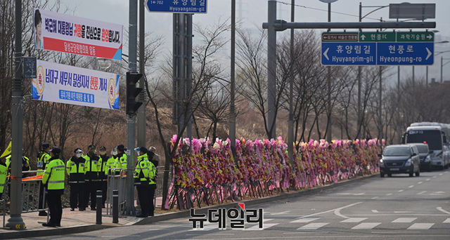 대구 달성군 유가읍에 마련된 박근혜 전 대통령 사저 인근 도로에 24일 오전 지지자들이 보낸 축하화환과 응원 현수막이 설치돼 있다.