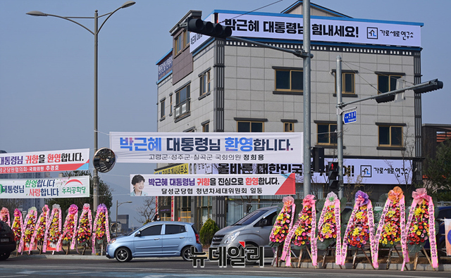 김세의 가로세로연구소 대표가 24일 대구 달성군 유가읍에 마련한 사무실 앞에 박근혜 전 대통령의 저서를 진열하고 있다. 박 전 대통령은 이날 오전 삼성서울병원에서 퇴원해 박정희 대통령 묘역을 참배하고 대구 사저에 입주했다. (대구=정상윤 기자)