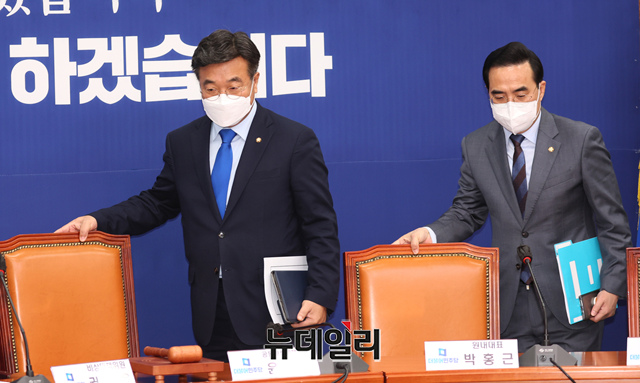 윤호중 더불어민주당 공동비상대책위원장과 박홍근 원내대표가 25일 오전 국회에서 열린 비상대책위원회 회의에 참석하고있다. (사진=공동취재단)