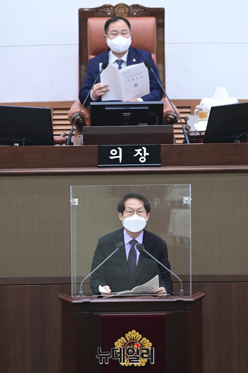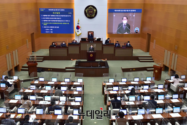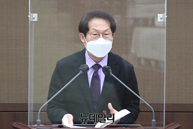 조희연 서울시교육감이 25일 오후 서울 중구 서울시의회 본회의장에서 열린 제306회 시의회 임시회 본회의에서 2022년도 제1회 추가경정예산안을 관련해 연설을 하고 있다.
