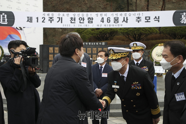 이준석 국민의힘 대표가 26일 오전 경기 평택시 해군2함대사령부에서 열린 천안함 46용사 제12주기 추모행사에 참석해 유족들과 인사를 나누고 있다. (사진=국민의힘)