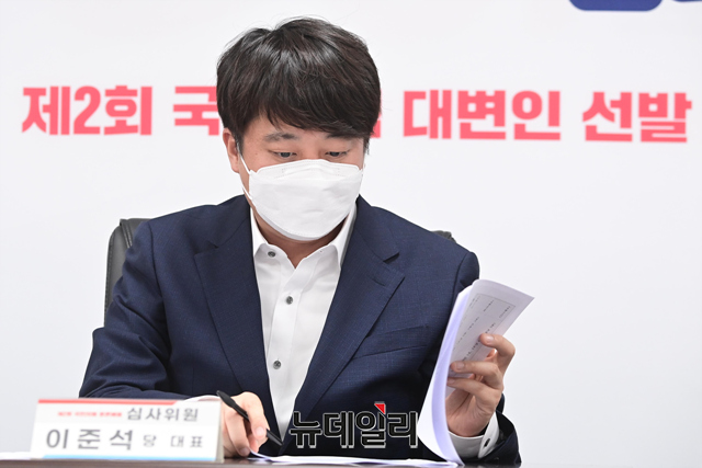 이준석 국민의힘 대표가 28일 오후 서울 여의도 국민의힘 중앙당사에서 열린 '2022 나는 국대다 2기' 압박면접에서 자료를 살피며 발언을 하고 있다.'2022 나는 국대다'는 당 대변인을 토론을 통해 선발하는 공개 오디션이다. 1차 심사를 통해 선정된 상위 100명은 중앙당사에서 면접을 통해 16강을 향한 경쟁을 펼친다.심사위원은 이준석 당 대표, 김용태 최고위원, 허은아 수석대변인, 김철근 당대표정무실장, 임승호 전 대변인, 양준우 전 대변인, 신인규 전 상근부대변인, 김연주 전 상근부대변인이다.