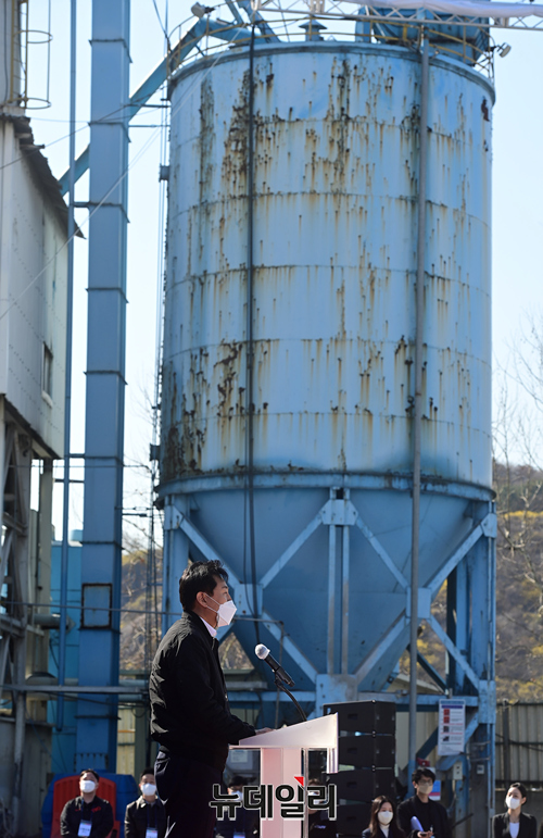오세훈 서울시장이 28일 오후 서울 성동구 삼표레미콘 성수공장 철거 착공식에 참석해 발언하고 있다.