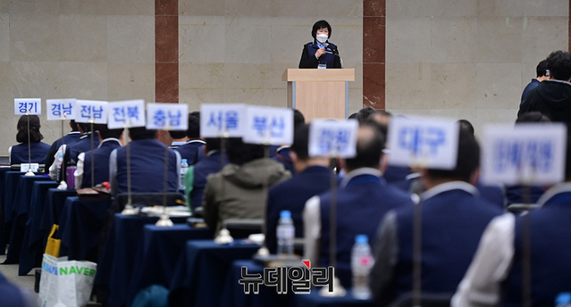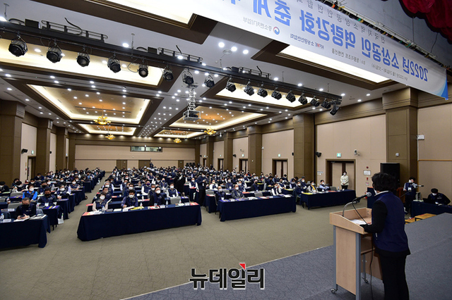 오세희 소상공인연합회장이 29일 오후 충북 제천시 청풍리조트 컨벤션홀에서 열린 2022 소상공인 역량강화 춘계 워크숍에서 개회사를 하고 있다.