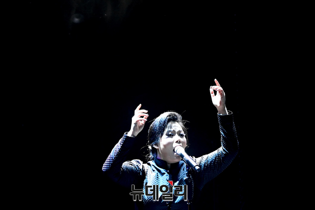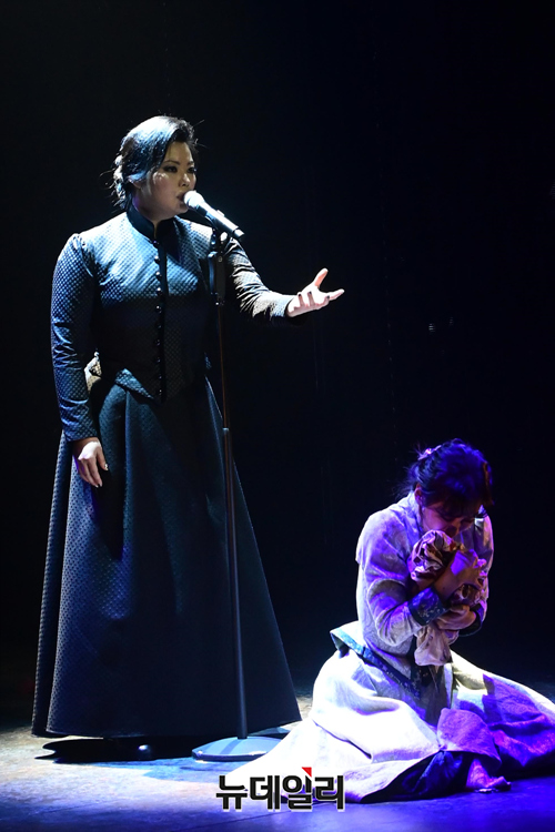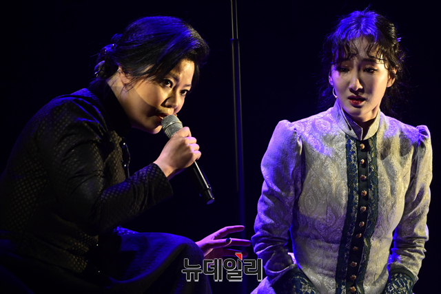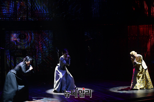 배우 유리아, 김려원, 제이민, 최현선이 29일 오후 서울 종로구 두산아트센터에서 열린 록뮤지컬 '리지' 프레스콜에서 하이라이트 장면을 선보이고 있다.'리지'는 1892년 미국 매사추세츠에서 일어난 미제 살인 사건 '리지 보든 사건' 실화를 모티브로 만들어진 뮤지컬이다.