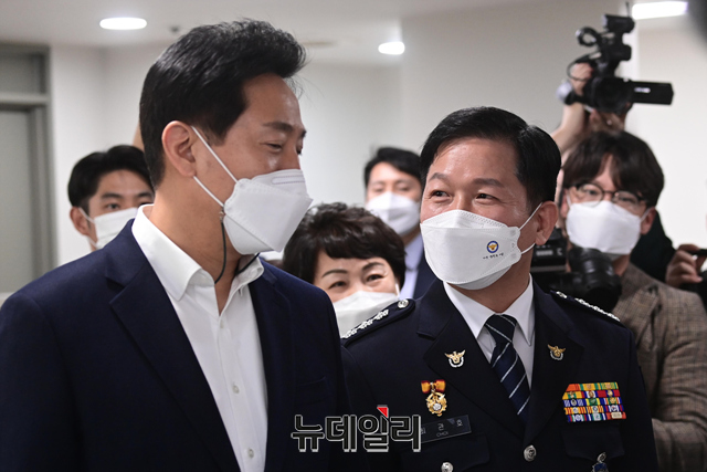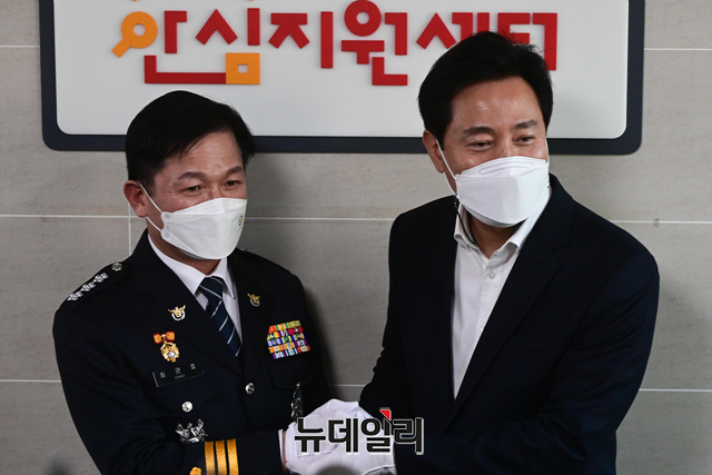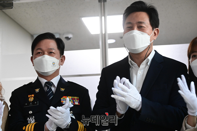 오세훈 서울시장과 최관호 서울경찰청장을 비롯한 참석자들이 29일 오후 서울 동작구 서울시여성가족재단에서 열린 서울시 디지털성범죄 안심지원센터 개관식에서 현판 제막에 앞서 기념촬영을 하고 있다.
