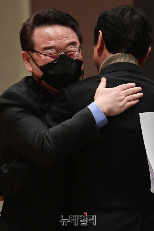 조전혁 서울시교육감 예비후보가 30일 오전 서울 중구 한국프레스센터에서 열린 중도·보수 단일 후보 발표에서 선출 직후 최명복 후보의 축하를 받고 있다.
